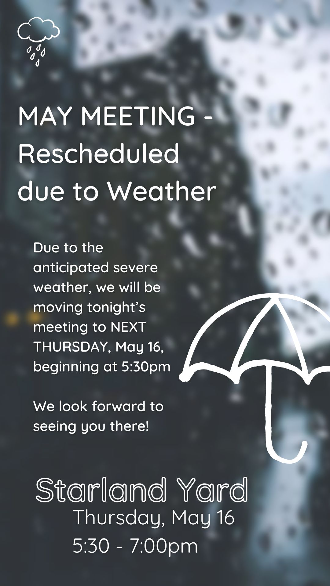 UPDATE 5/9/2024: Due to the anticipated severe weather for the afternoon / evening of May 9, we are rescheduling this event to Thursday, May 16 - see you then!
