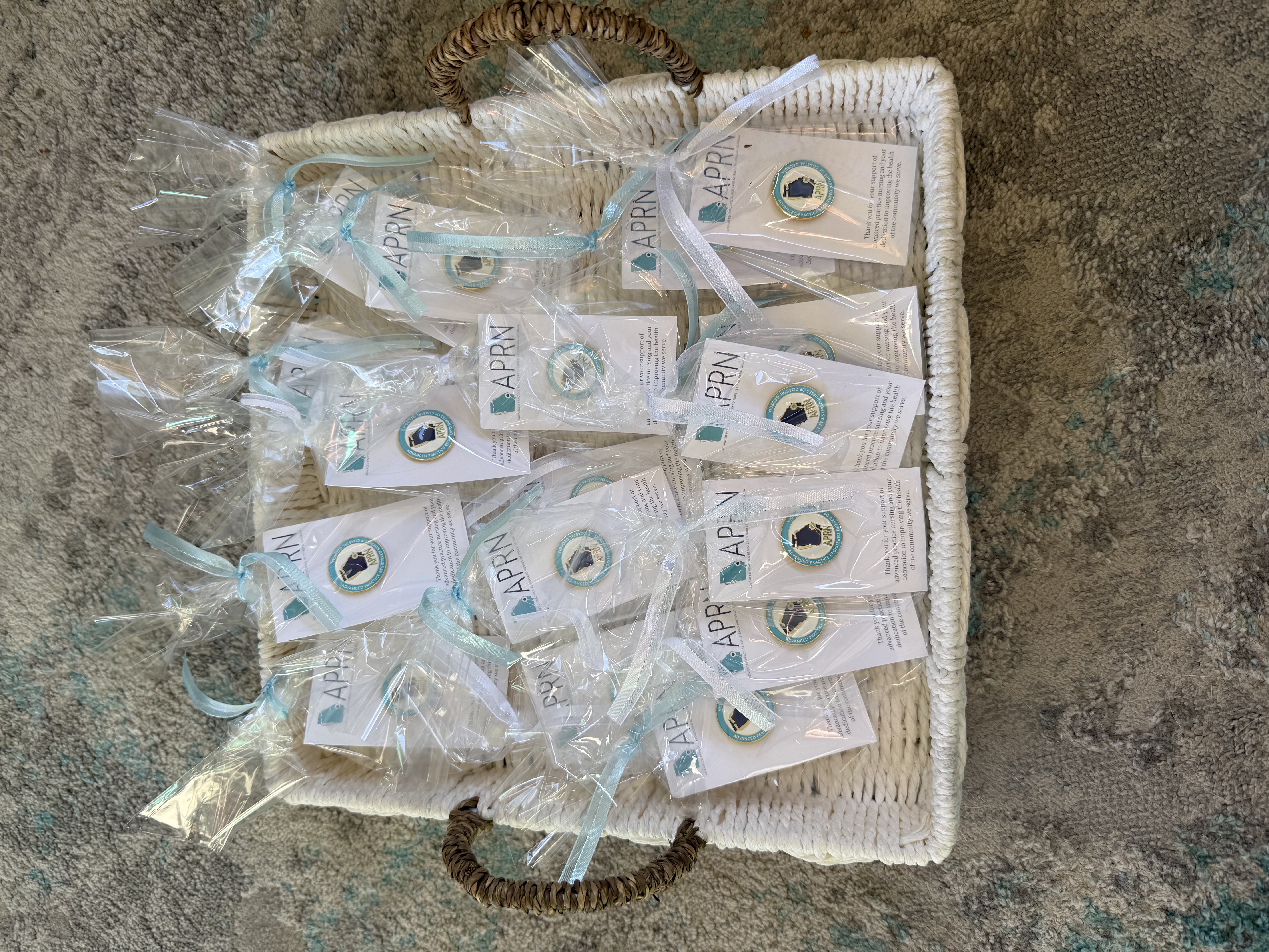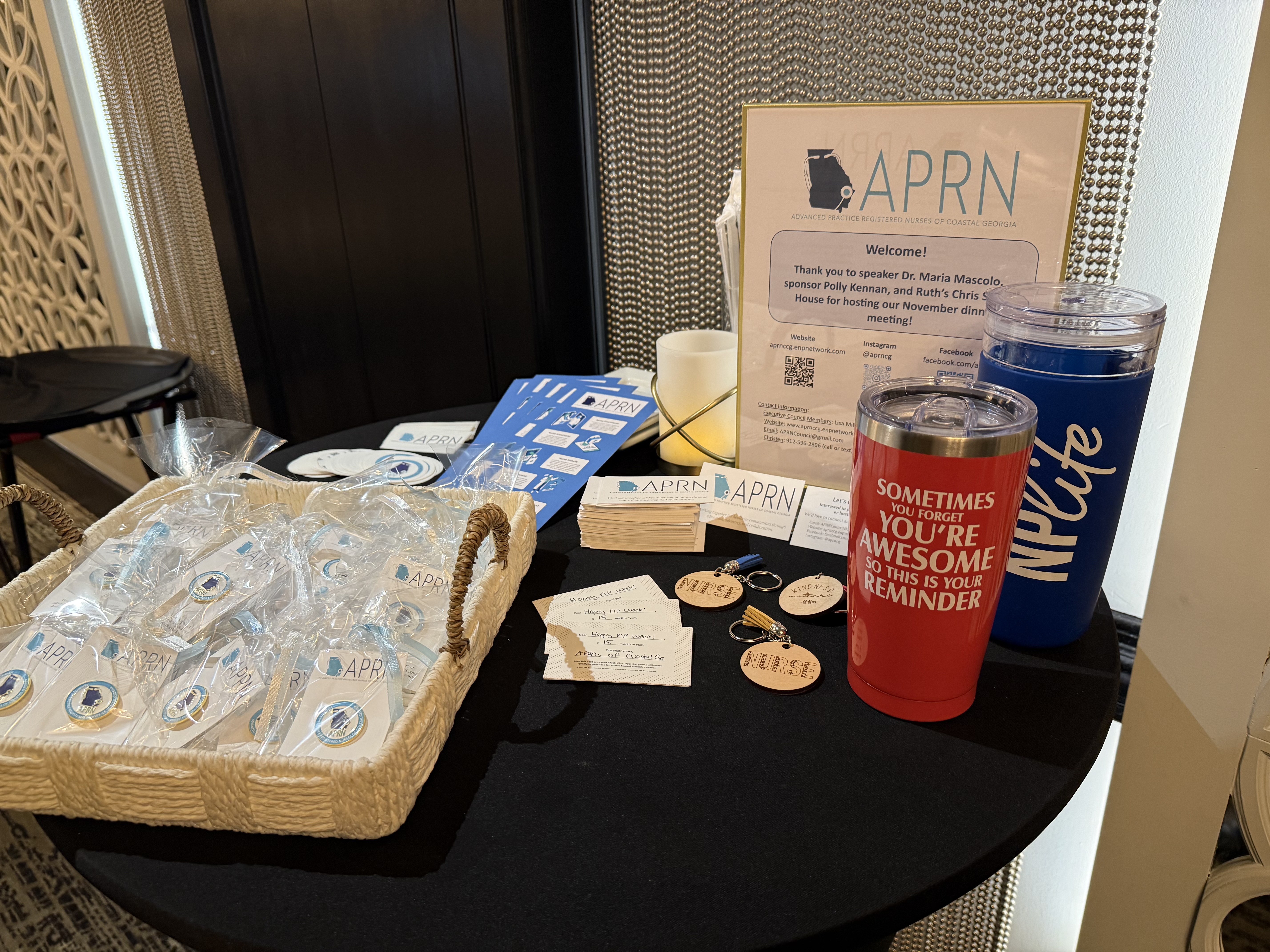 This meeting was also held during Nurse Practitioner Week! In honor of this occasion and in gratitude for their support of our group, each of our active members received our newly released APRNCG Nursing Pins. Several of our members also won a drawing for prizes, including water and coffee cups, cute nursing keychains, and gift cards for Chick-Fil-A.