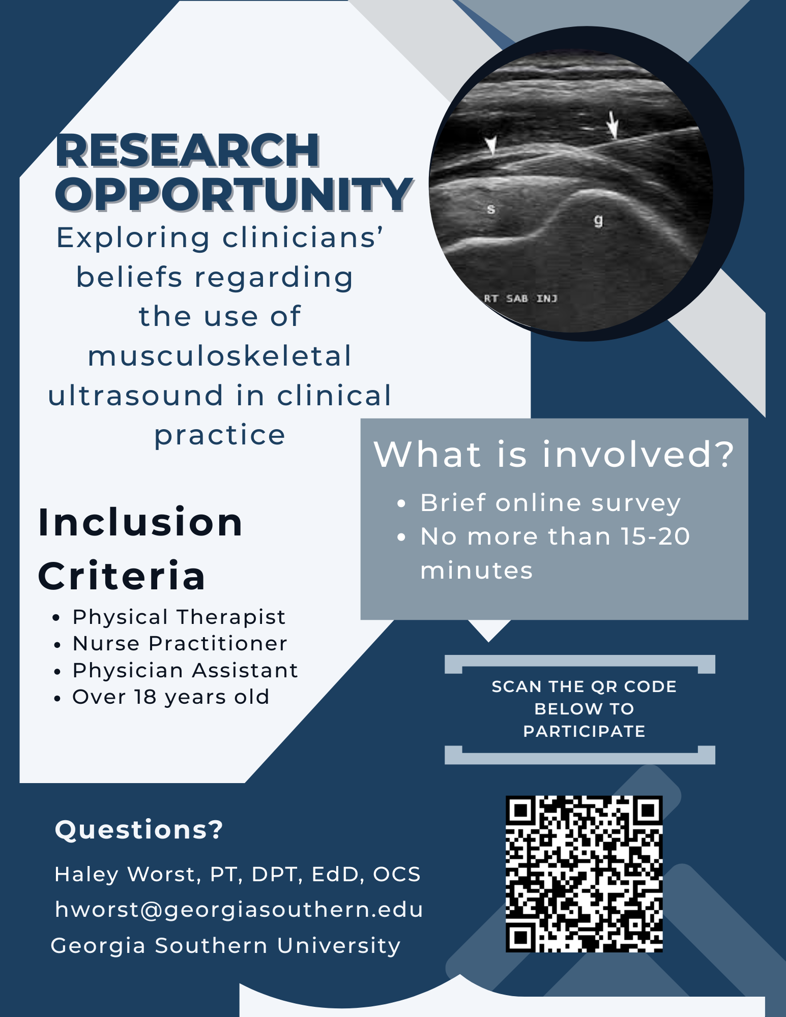 Georgia Southern University is seeking participants for a research study exploring clinicians beliefs regarding the use of musculoskeletal ultrasound in clinical practice. We have sent out this flyer before, so if you have already participated - thank you! If not, please consider taking a few minutes to do so. Please see the attached flyer for details.